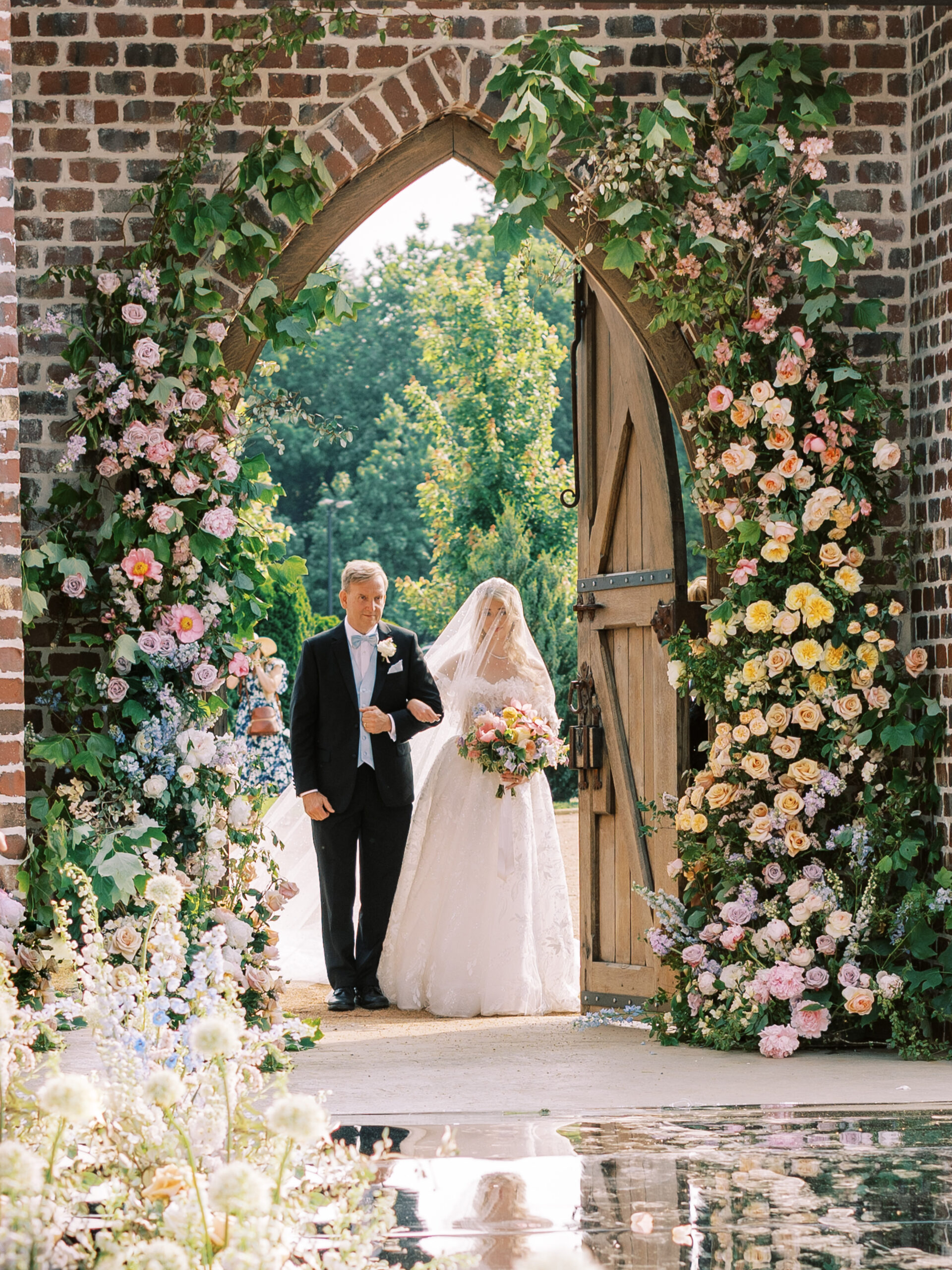 The Ceremony Courtyard: Enclosed by the historic charm of French castle doors and Italian plaster walls, this secluded garden, with its marble dome and waterside views, offers an intimate setting for vows.